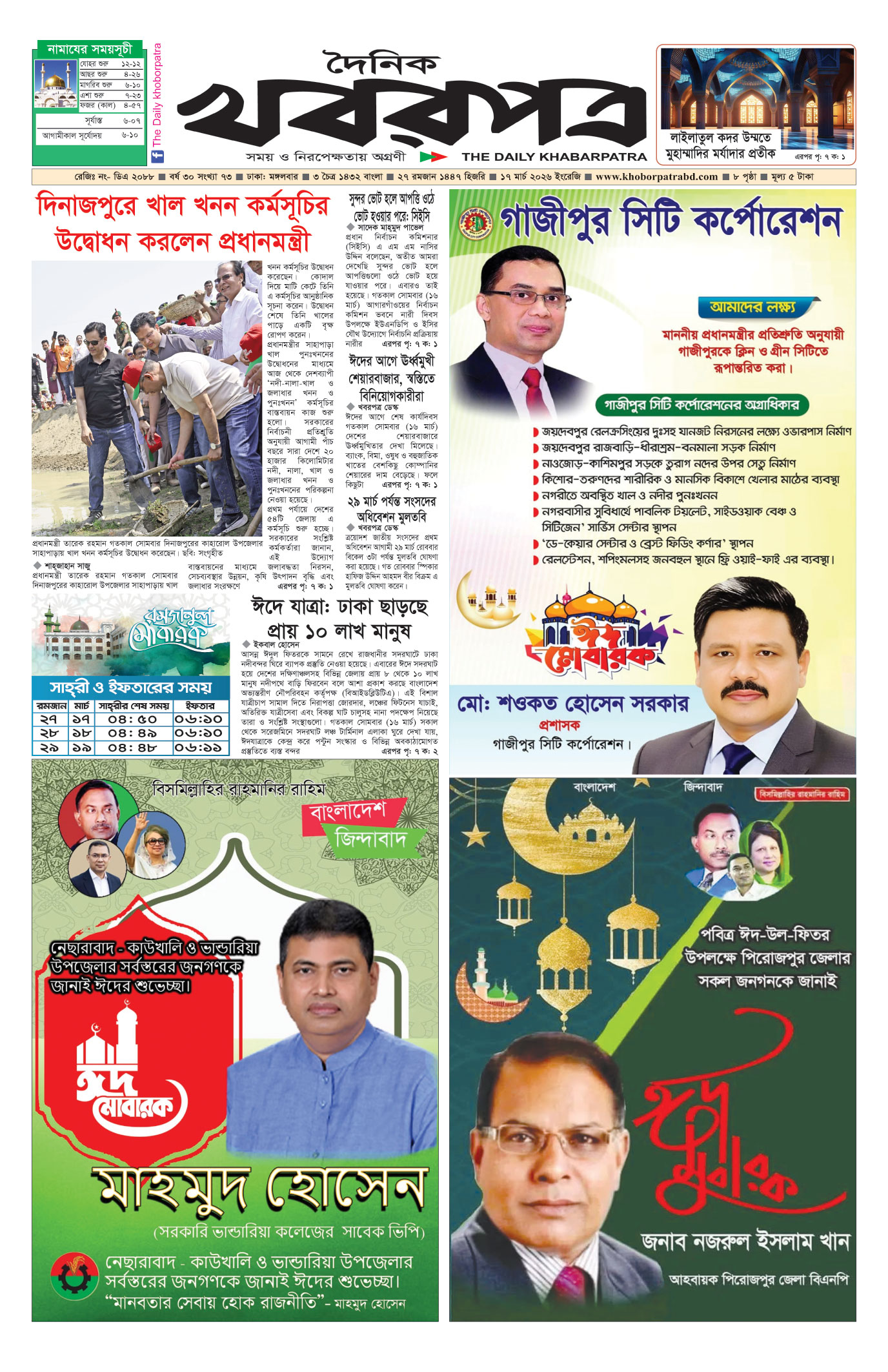 প্রধান সম্পাদক: মাফরুজা সুলতানা, সম্পাদক: ব্যারিষ্টার মোহাম্মদ মারুফ ইব্রাহীম (আকাশ)। মোঃ হাফিজ ইব্রাহিম কর্তৃক দি টাইমস প্রিন্টিং প্রেস লিমিটেড ৭/এ/১ তেজগাঁও শিল্প এলাকা, ঢাকা থেকে মুদ্রিত এবং প্রকাশিত। সম্পাদকীয় ও বাণিজ্যিক কার্যালয় : ৭/এ/১ তেজগাঁও শিল্প এলাকা, ঢাকা-১২০৮। ফোন : ৫৮১৫৪০৫১। Email : khabarpatrabd@gmail.com