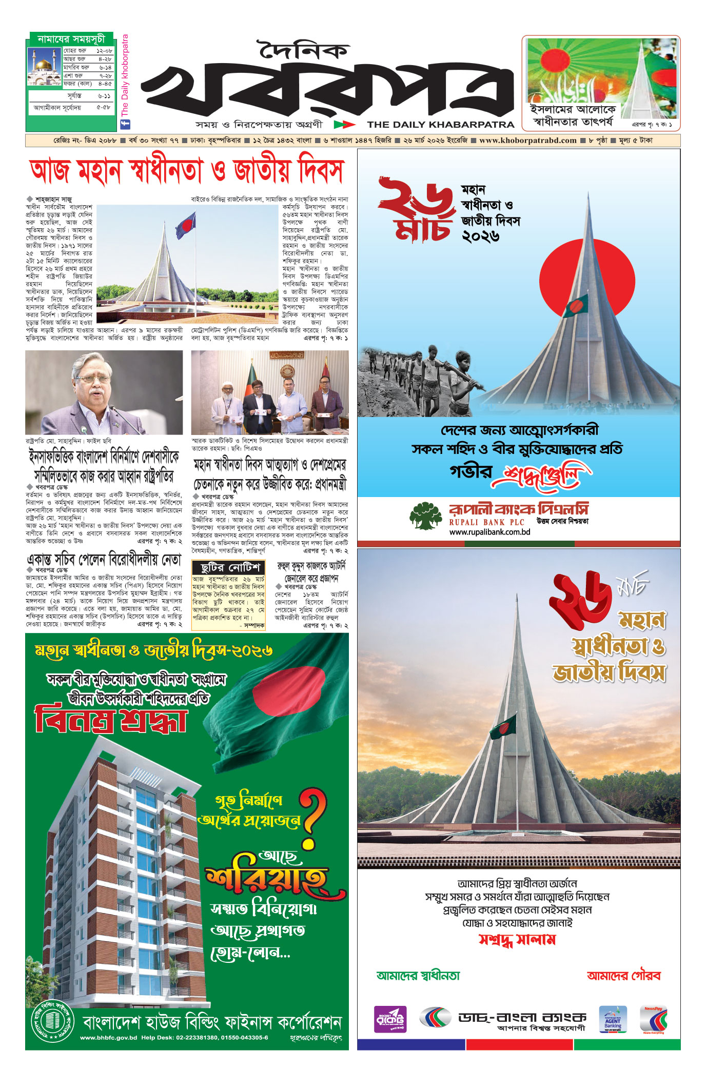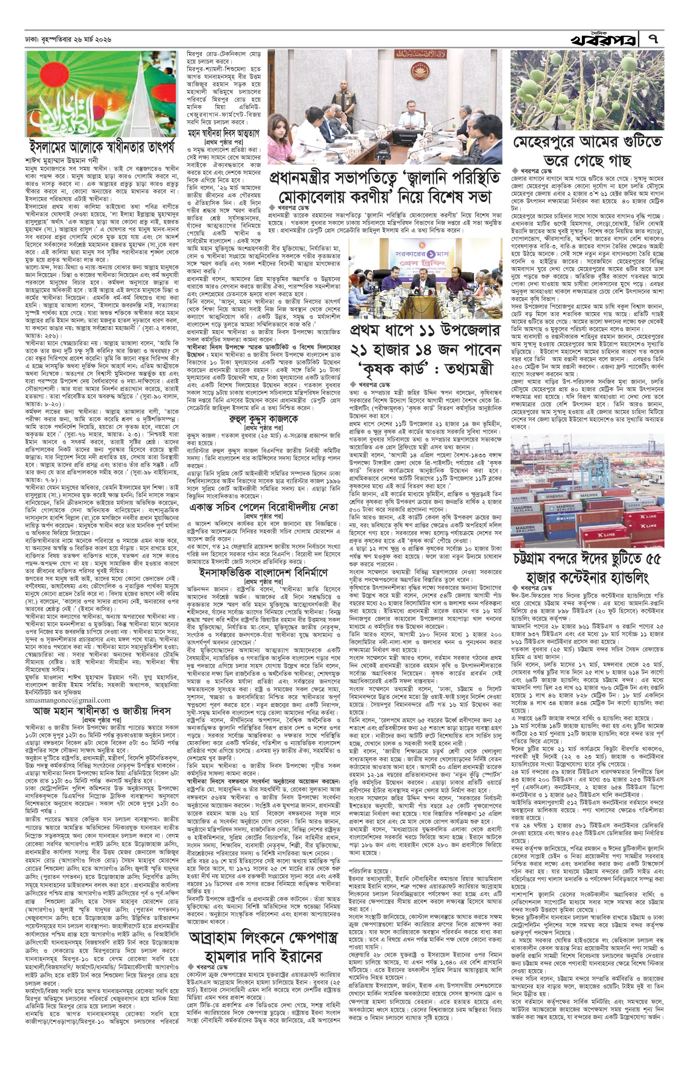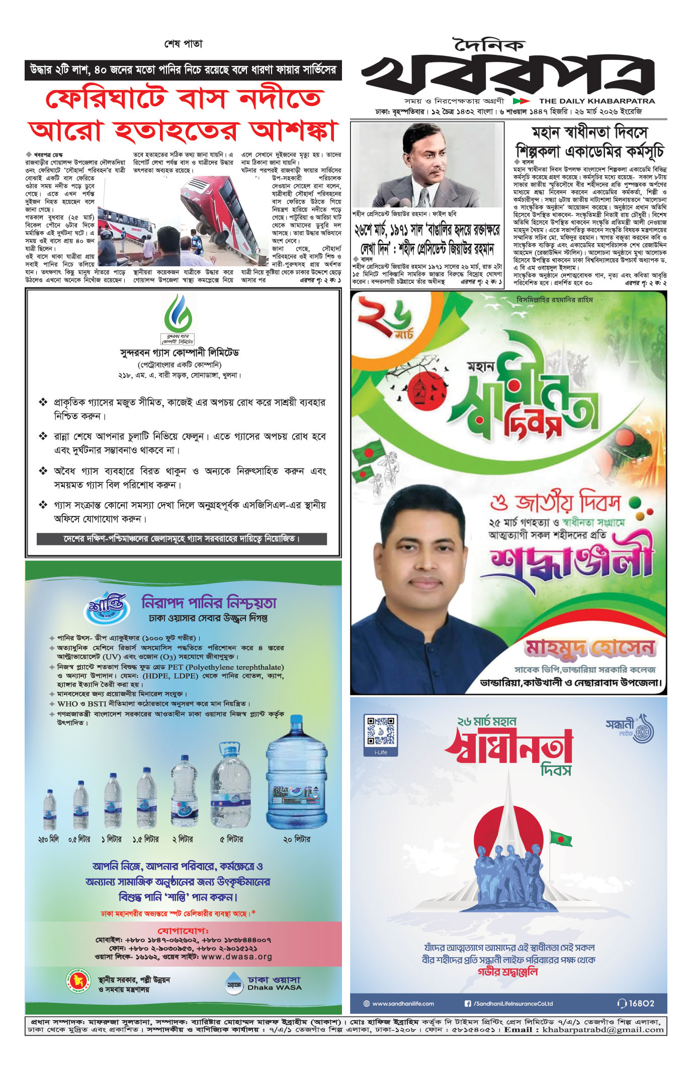 প্রধান সম্পাদক: মাফরুজা সুলতানা, সম্পাদক: ব্যারিষ্টার মোহাম্মদ মারুফ ইব্রাহীম (আকাশ)। মোঃ হাফিজ ইব্রাহিম কর্তৃক দি টাইমস প্রিন্টিং প্রেস লিমিটেড ৭/এ/১ তেজগাঁও শিল্প এলাকা, ঢাকা থেকে মুদ্রিত এবং প্রকাশিত। সম্পাদকীয় ও বাণিজ্যিক কার্যালয় : ৭/এ/১ তেজগাঁও শিল্প এলাকা, ঢাকা-১২০৮। ফোন : ৫৮১৫৪০৫১। Email : khabarpatrabd@gmail.com