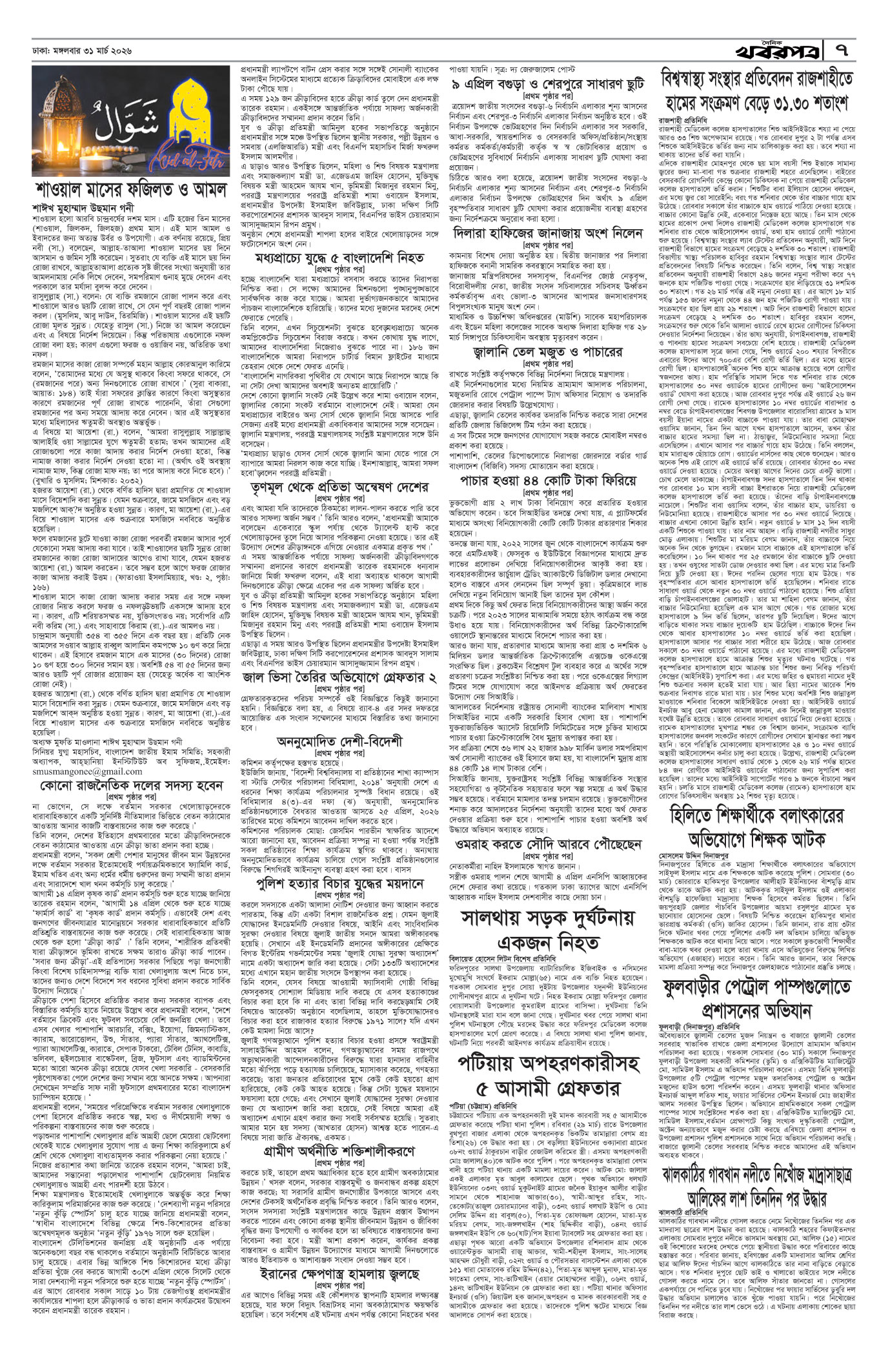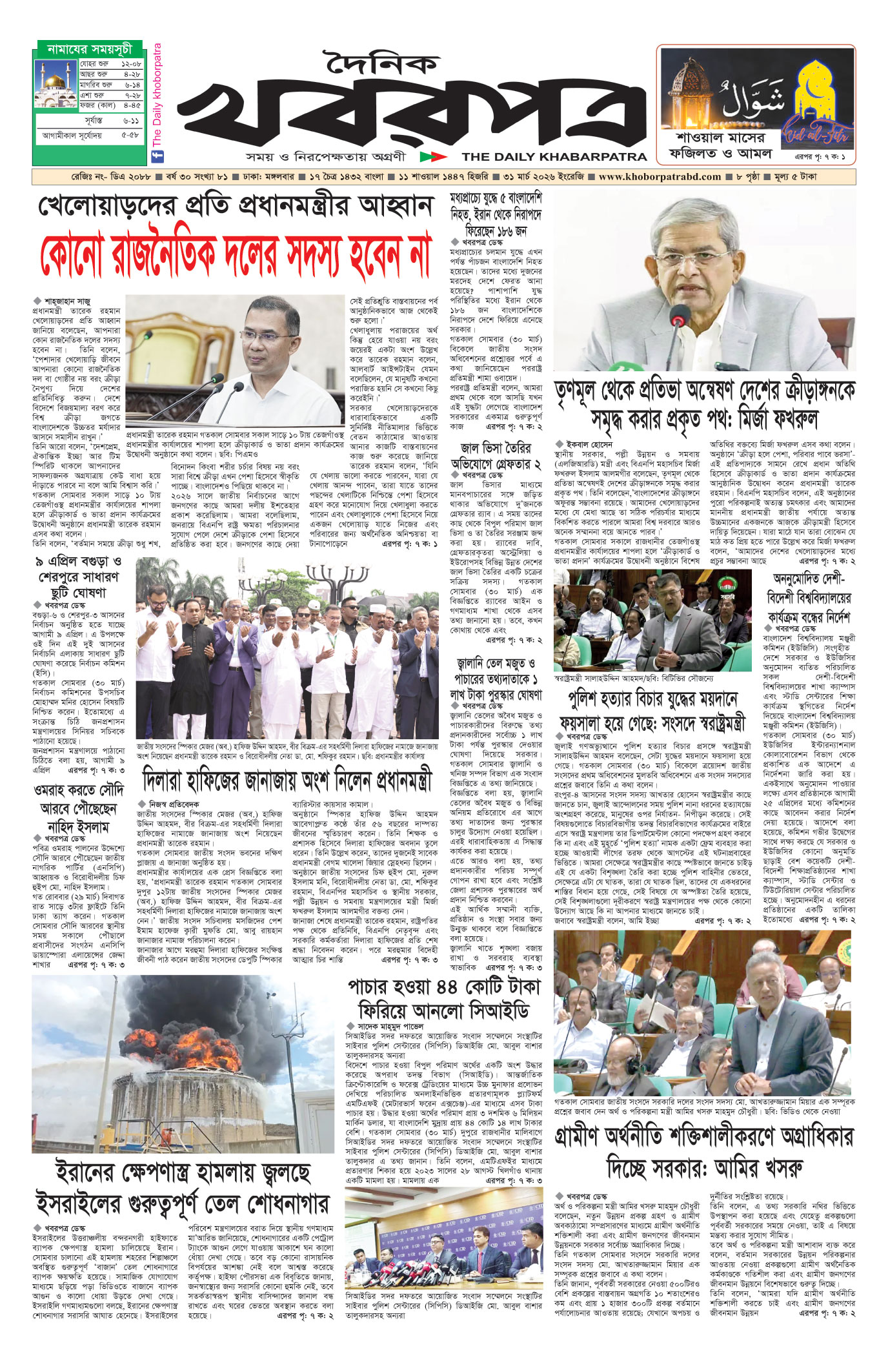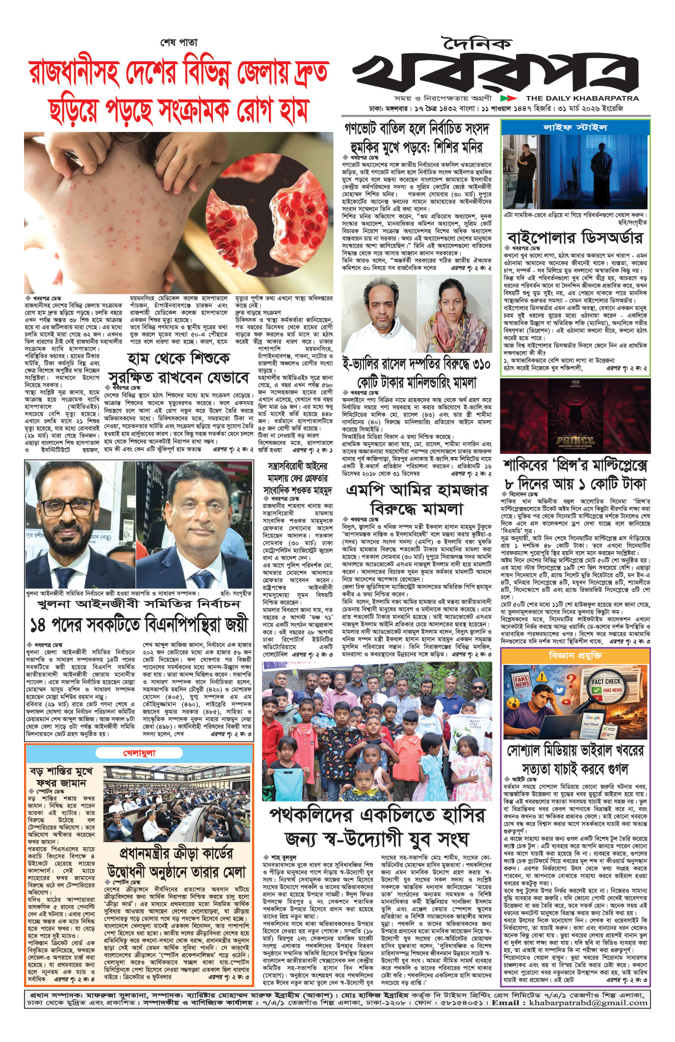 প্রধান সম্পাদক: মাফরুজা সুলতানা, সম্পাদক: ব্যারিষ্টার মোহাম্মদ মারুফ ইব্রাহীম (আকাশ)। মোঃ হাফিজ ইব্রাহিম কর্তৃক দি টাইমস প্রিন্টিং প্রেস লিমিটেড ৭/এ/১ তেজগাঁও শিল্প এলাকা, ঢাকা থেকে মুদ্রিত এবং প্রকাশিত। সম্পাদকীয় ও বাণিজ্যিক কার্যালয় : ৭/এ/১ তেজগাঁও শিল্প এলাকা, ঢাকা-১২০৮। ফোন : ৫৮১৫৪০৫১। Email : khabarpatrabd@gmail.com