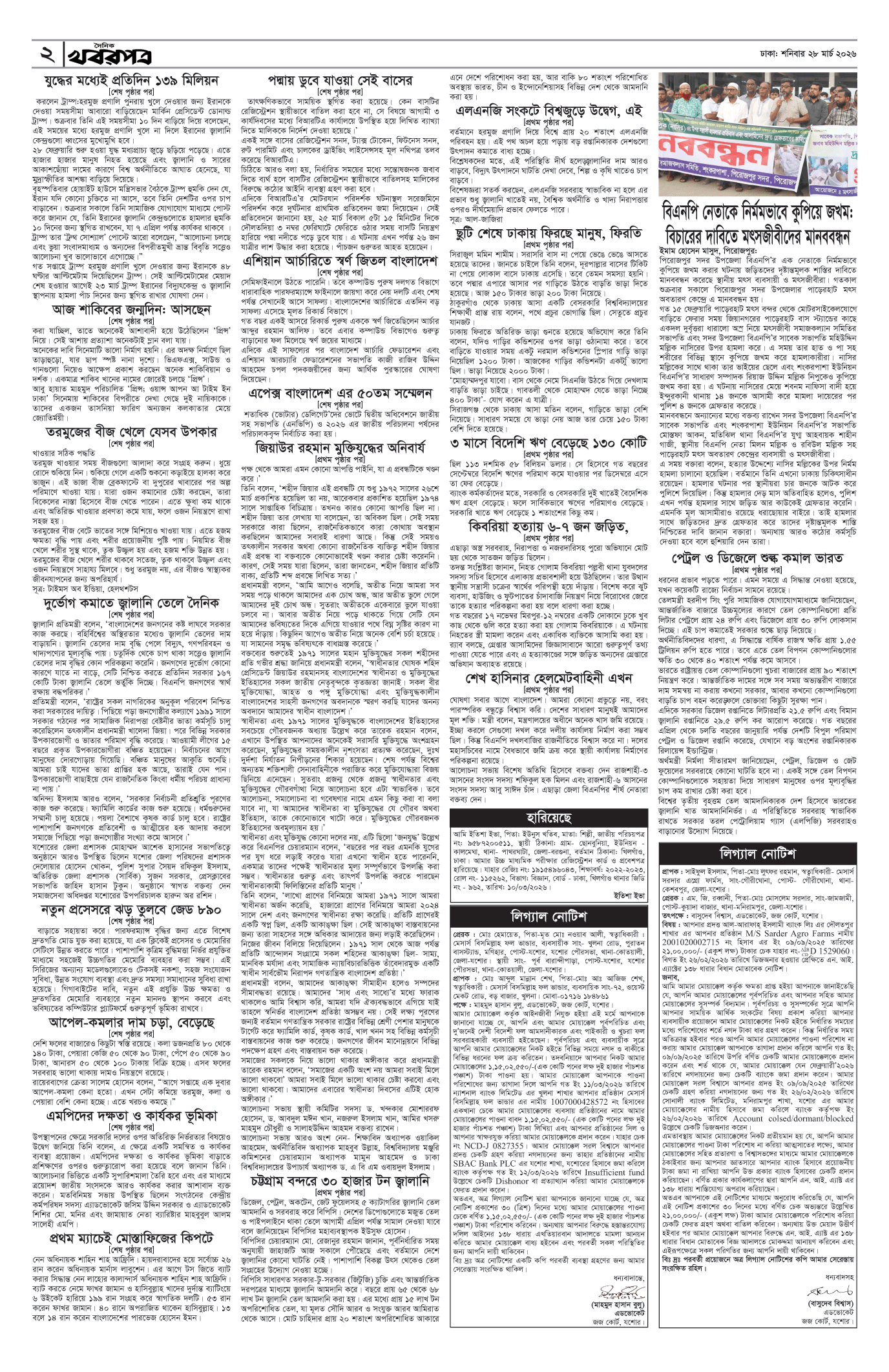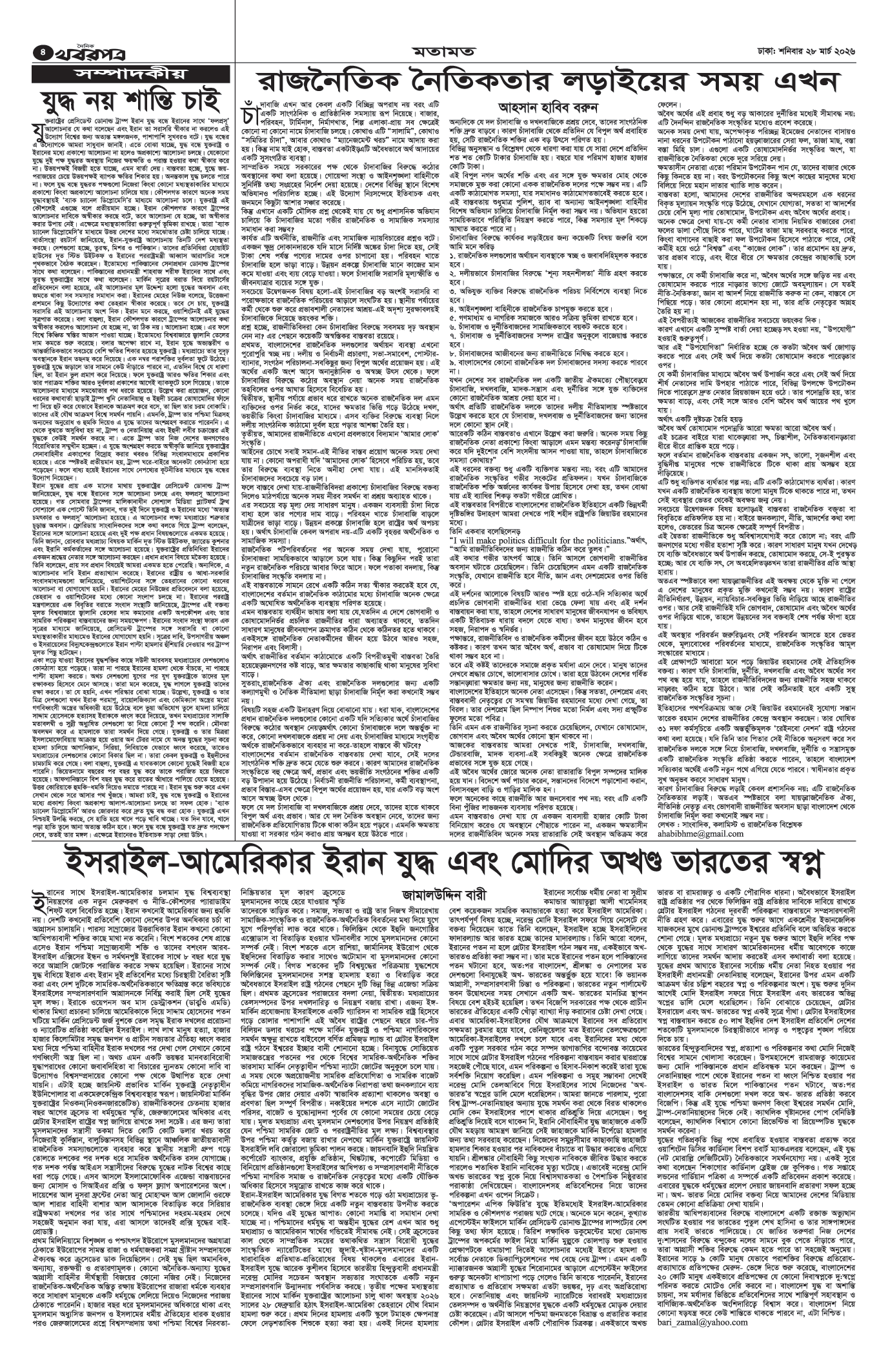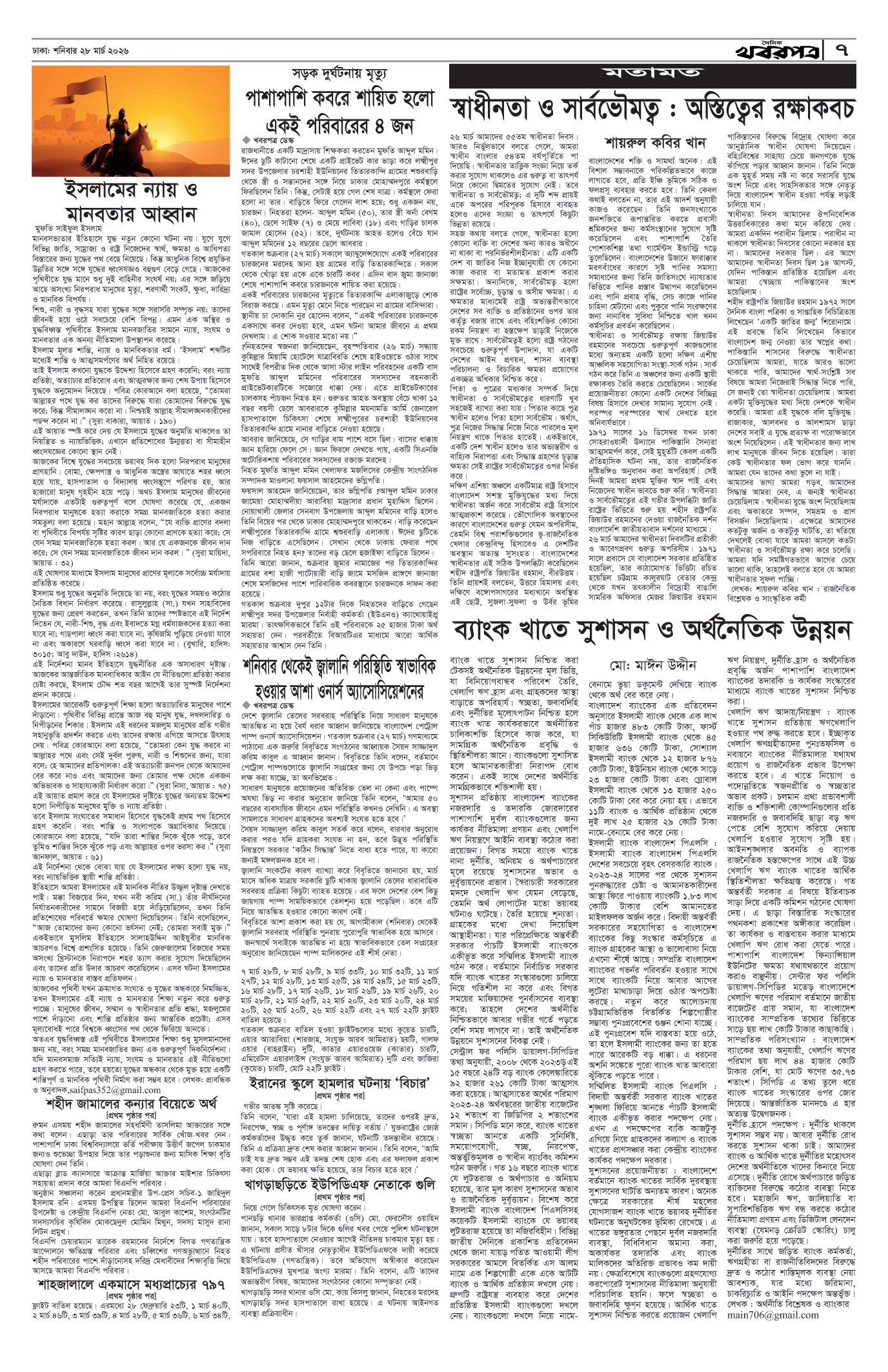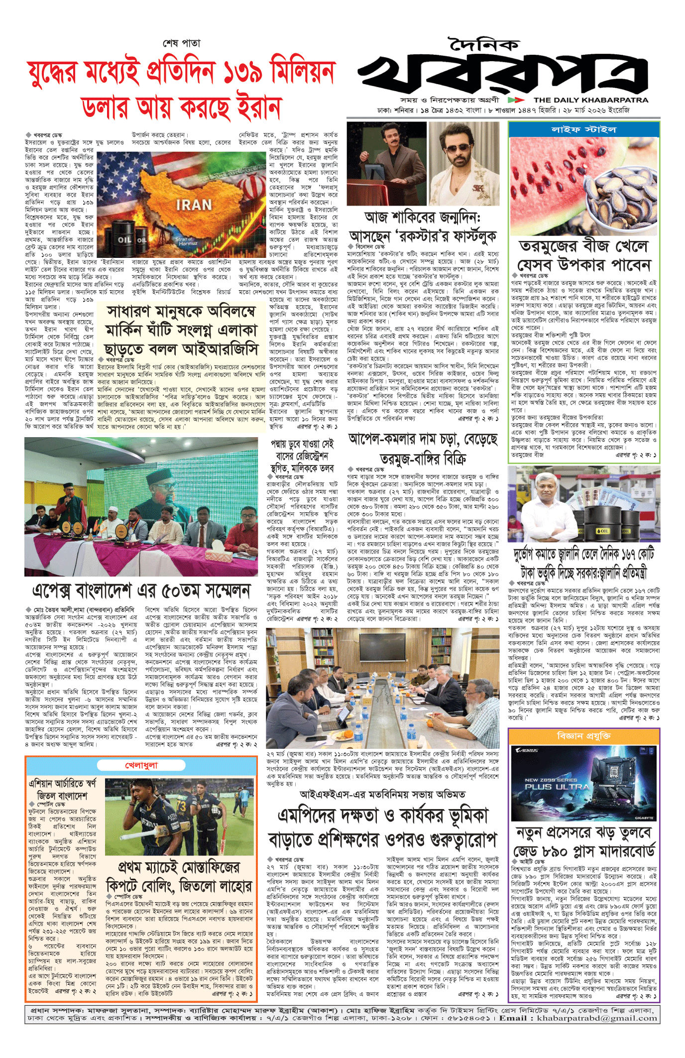 প্রধান সম্পাদক: মাফরুজা সুলতানা, সম্পাদক: ব্যারিষ্টার মোহাম্মদ মারুফ ইব্রাহীম (আকাশ)। মোঃ হাফিজ ইব্রাহিম কর্তৃক দি টাইমস প্রিন্টিং প্রেস লিমিটেড ৭/এ/১ তেজগাঁও শিল্প এলাকা, ঢাকা থেকে মুদ্রিত এবং প্রকাশিত। সম্পাদকীয় ও বাণিজ্যিক কার্যালয় : ৭/এ/১ তেজগাঁও শিল্প এলাকা, ঢাকা-১২০৮। ফোন : ৫৮১৫৪০৫১। Email : khabarpatrabd@gmail.com